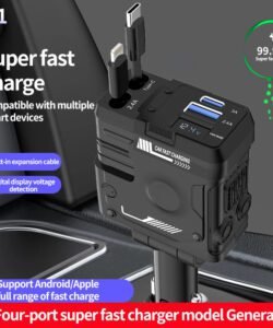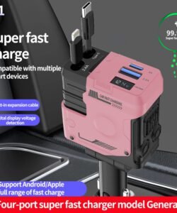Stay charged and organized with this retractable fast car charger. Features a 4-in-1 design, digital display, and 120W high-speed output for Type-C devices.